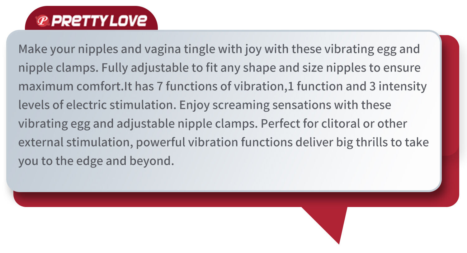 Make your nipples and vagina tingle with joy with these vibrating egg and nipple clamps. Fully adjustable to fit any shape and size nipples to ensure maximum comfort.It has 7 functions of vibration,1 function and 3 intensity levels of electric stimulation. Enjoy screaming sensations with these vibrating egg and adjustable nipple clamps. Perfect for clitoral or other external stimulation, powerful vibration functions deliver big thrills to take you to the edge and beyond.