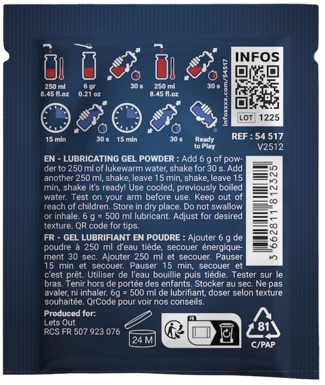 Once mixed with water, use within a few hours. Keep out of reach of children. Avoid contact with eyes, damaged skin, and wounds. If irritation occurs, discontinue use and consult a doctor if it persists. Test on a small area. If redness, allergies, or discomfort occur, do not use. This lubricant is not a contraceptive. It does not contain spermicide. Do not swallow.