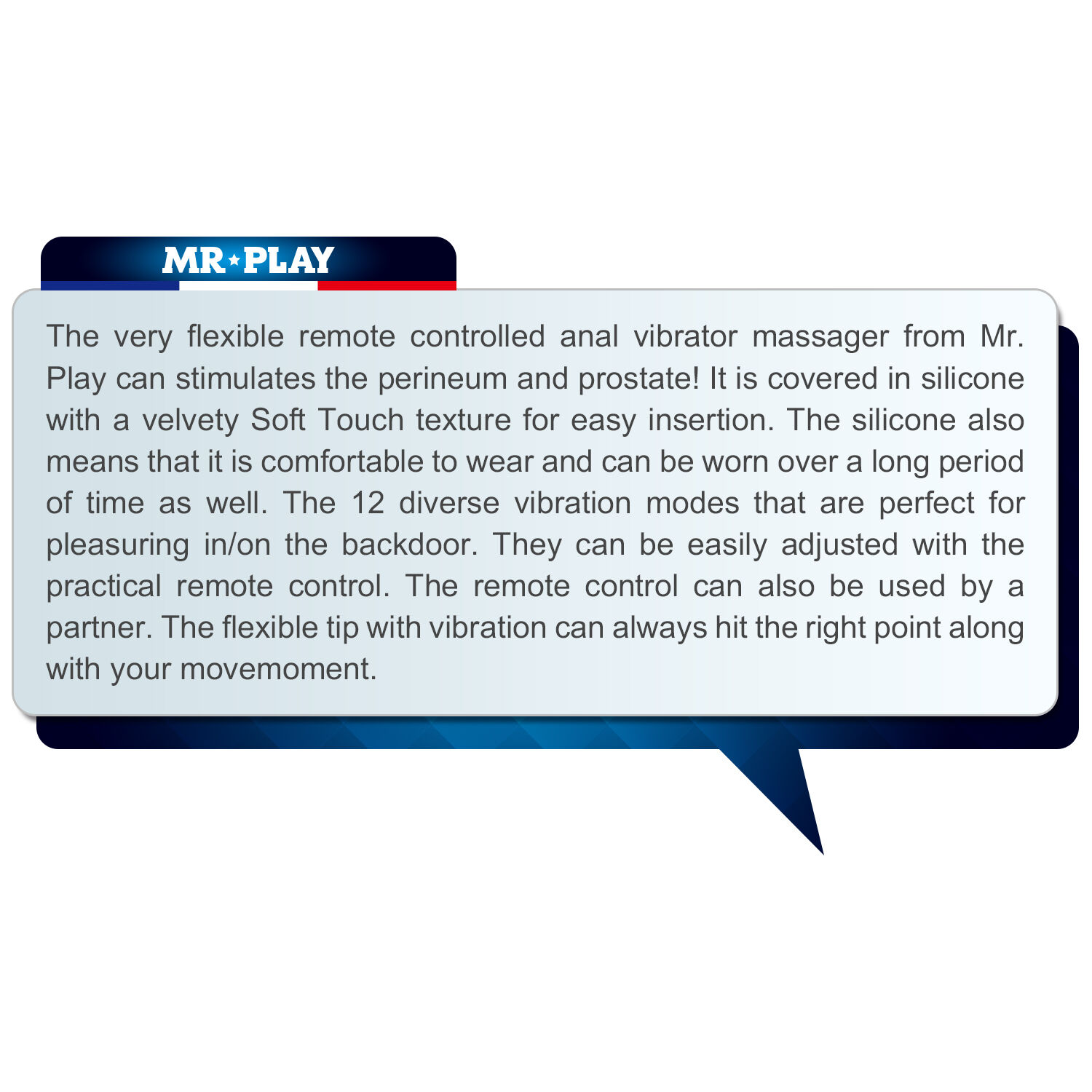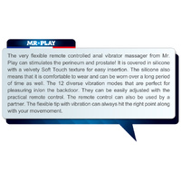 The very flexible remote controlled anal vibrator massager from Mr. Play can stimulates the perineum and prostate! It is covered in silicone with a velvety Soft Touch texture for easy insertion. The silicone also means that it is comfortable to wear and can be worn over a long period of time as well. The 12 diverse vibration modes that are perfect for pleasuring in/on the backdoor. They can be easily adjusted with the practical remote control. The remote control can also be used by a partner. The flexible tip with vibration can always hit the right point along with your movemoment.