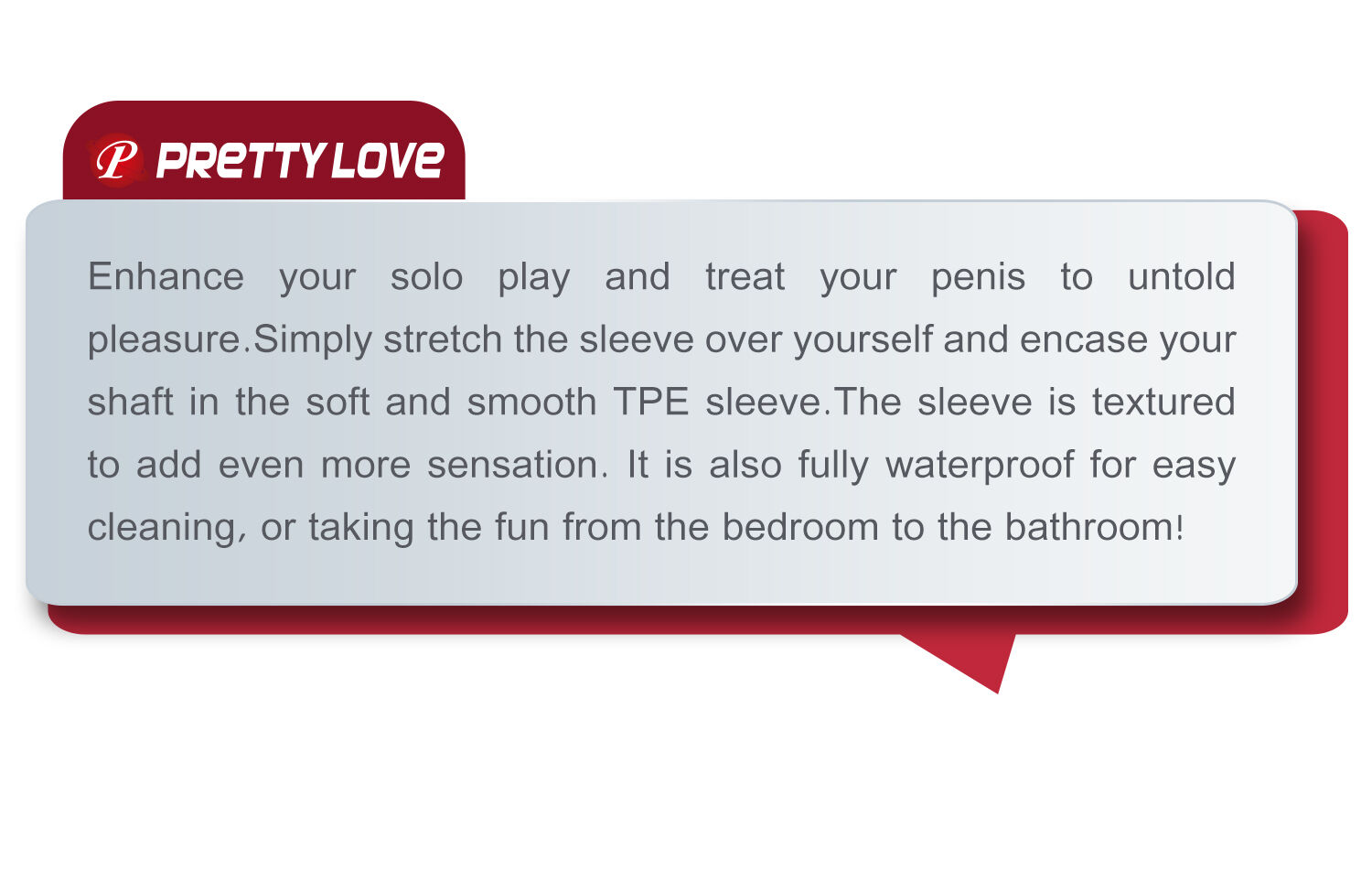 Enhance your solo play and treat your penis to untold pleasure.Simply stretch the sleeve over yourself and encase your shaft in the soft and smooth TPE sleeve.The sleeve is textured to add even more sensation. It is also fully waterproof for easy cleaning, or taking the fun from the bedroom to the bathroom!