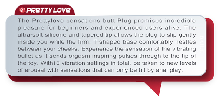 The Prettylove Sensations butt Plug promises incredible pleasure for beginners and experienced users alike. The ultra-soft silicone and tapered tip allows the plug to slip gently inside you while the firm, T-shaped base comfortably nestles between your cheeks. Experience the sensation of the vibrating bullet as it sends orgasm-inspiring pulses through to the tip of the toy. With ten vibration settings in total, be taken to new levels of arousal with sensations that can only be hit by anal play.
